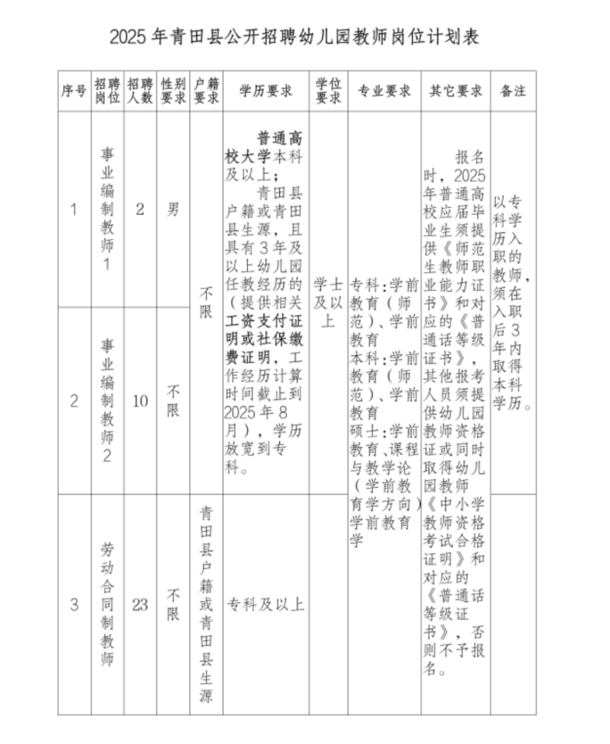 为满足我县教育事业发展的需要,根据《浙江省事业单位公开招聘人员暂行办法》(浙人才〔2007〕184号)、《青田县学前教育后备教师管理办法(试行)》(青教人〔2020〕57号)等文件精神,经研究,决定面向社会公开招聘幼儿园教师。