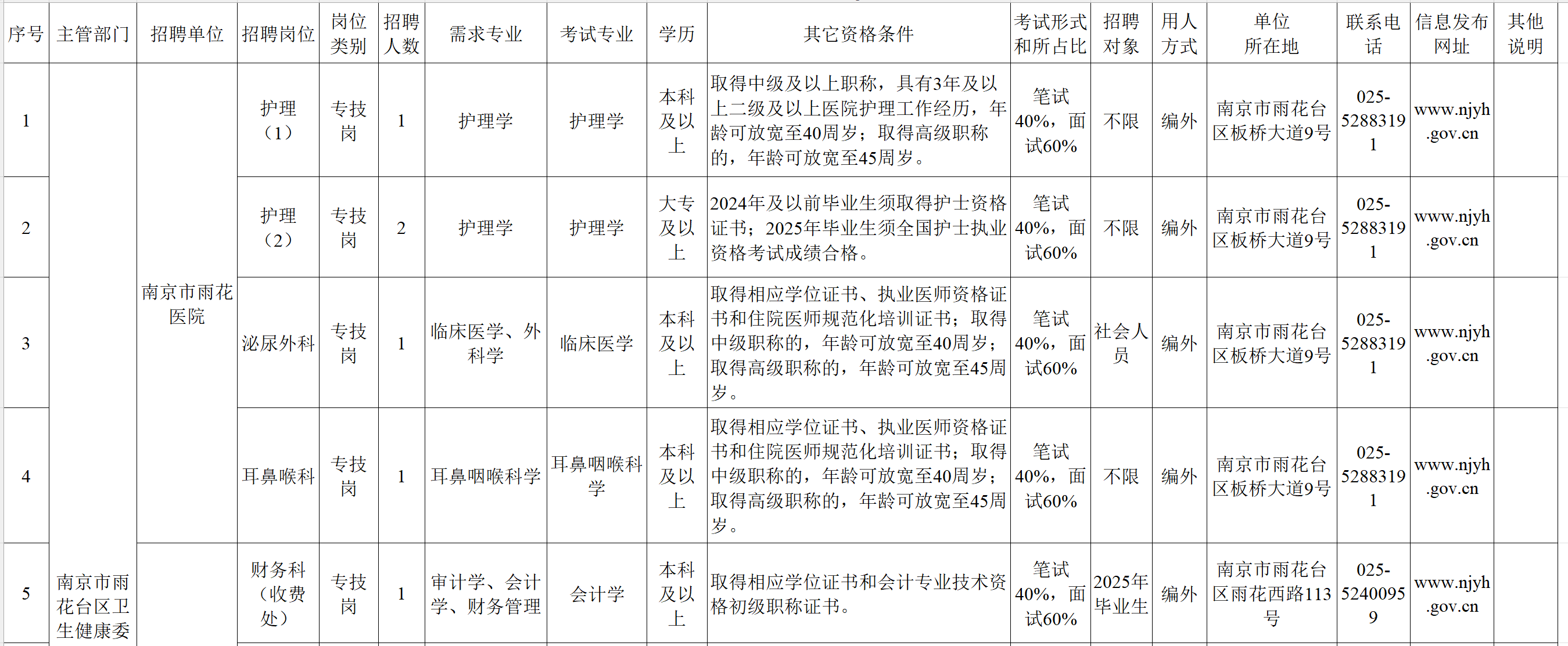 2025年南京市雨花台区卫生健康委员会所属部分事业单位公开招聘编外人员 (第二批)公告