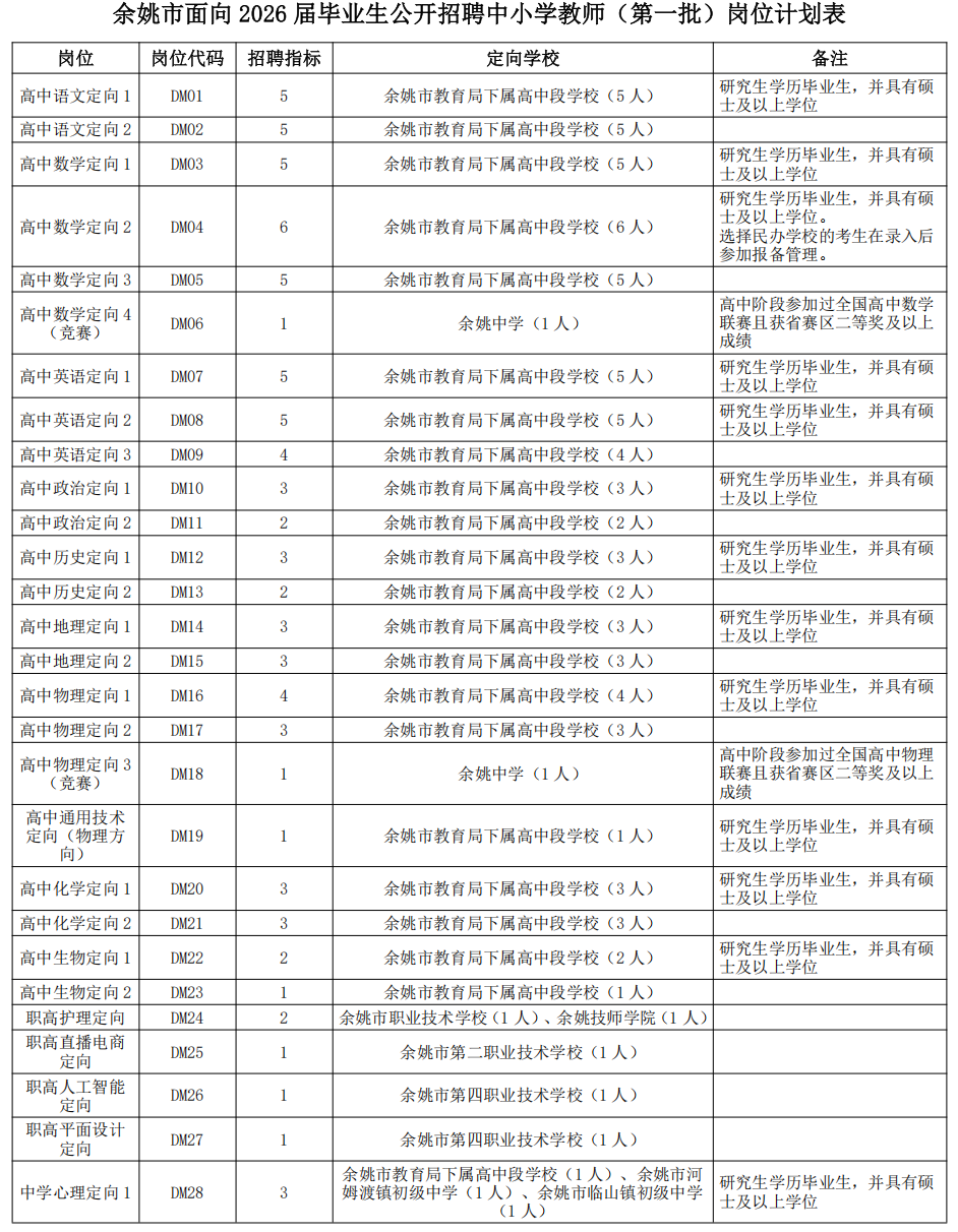 余姚市面向2026届毕业生公开招聘中小学教师公告(第一批)
