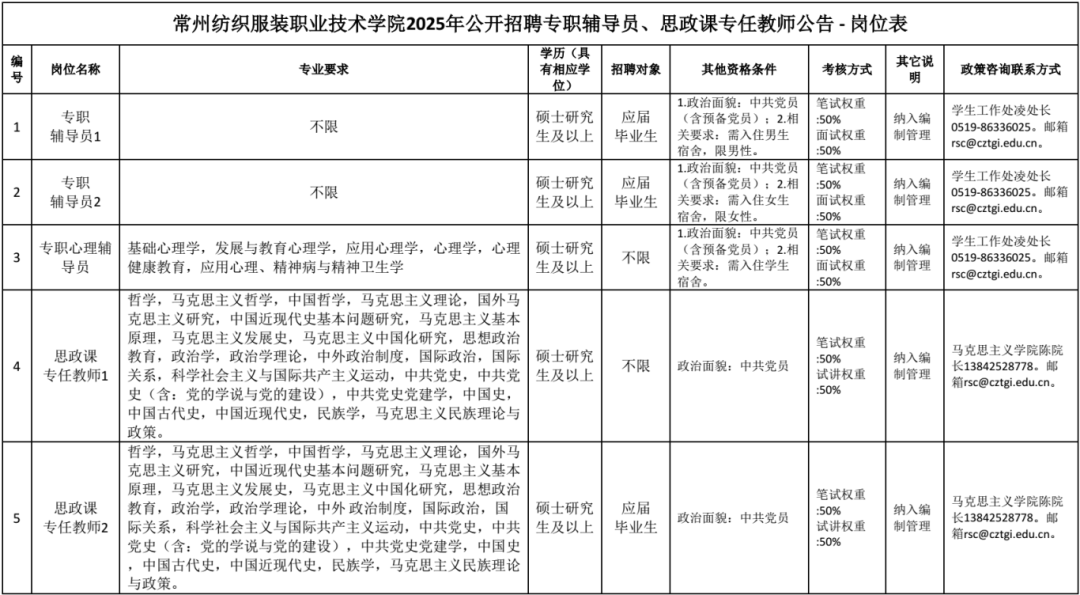 常州纺织服装职业技术学院2025年公开招聘专职辅导员、思政课专任教师公告