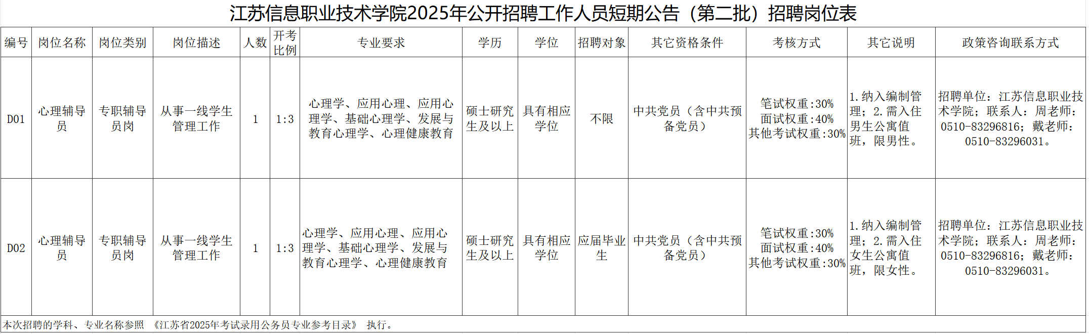 江苏信息职业技术学院2025年公开招聘工作人员短期公告(第二批)