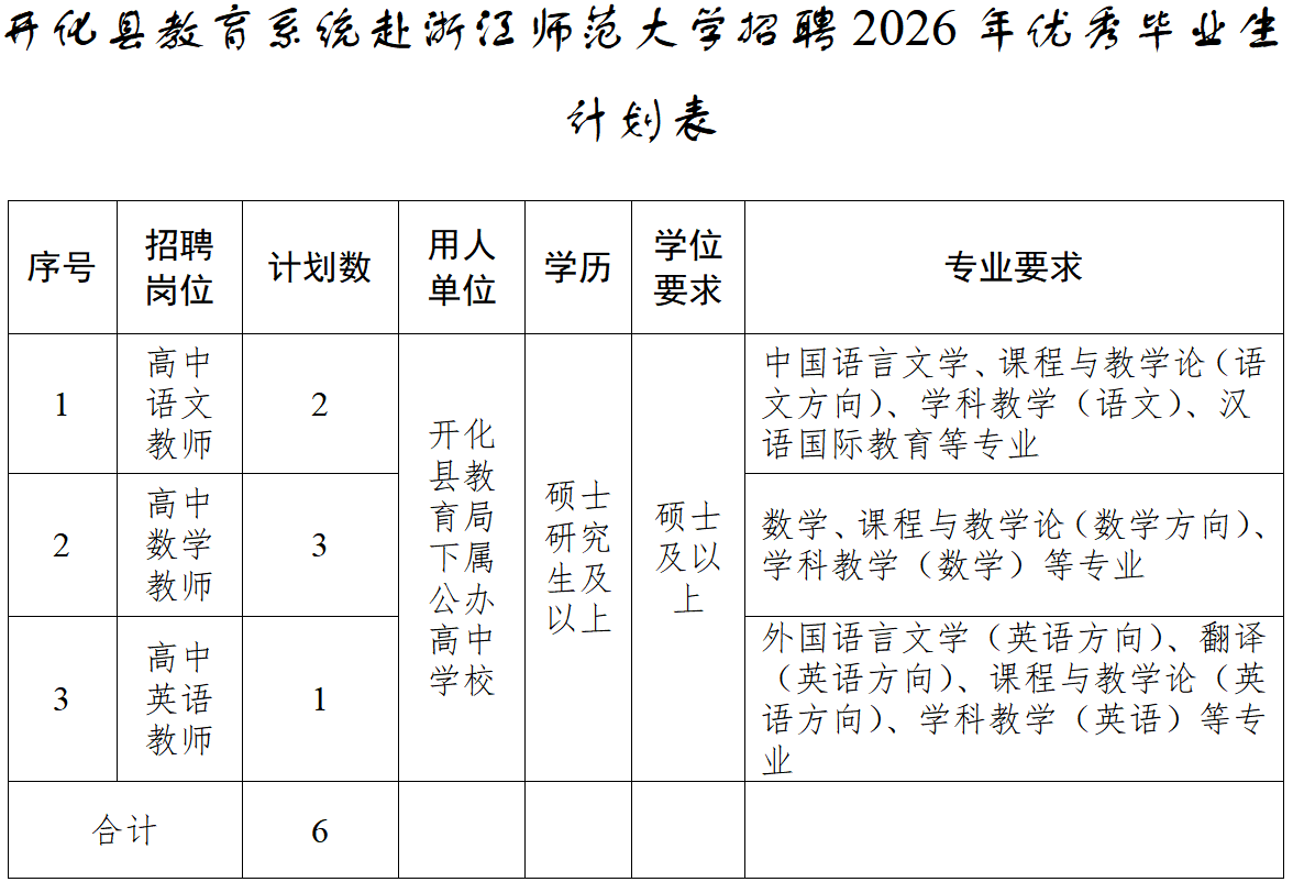 开化县人力社保局关于开化县教育系统赴浙江师范大学招聘2026年优秀毕业生的公告(第7号)