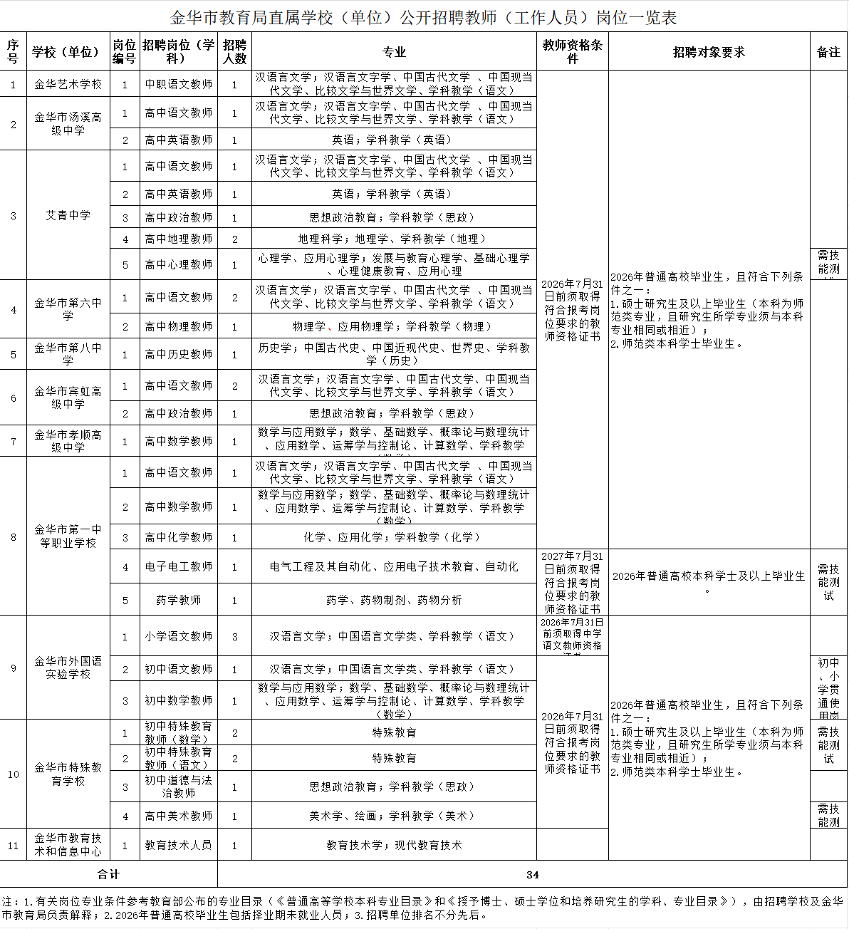 根据《金华市属事业单位公开招聘人员细则》有关规定,结合事业人员队伍建设需要,金华市教育局直属学校(单位)计划公开招聘事业编制教师(工作人员)34名。现就有关事项公告如下: