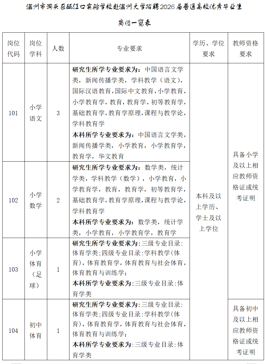 温州市洞头区瓯江口实验学校赴温州大学招聘2026届高校优秀毕业生的公告