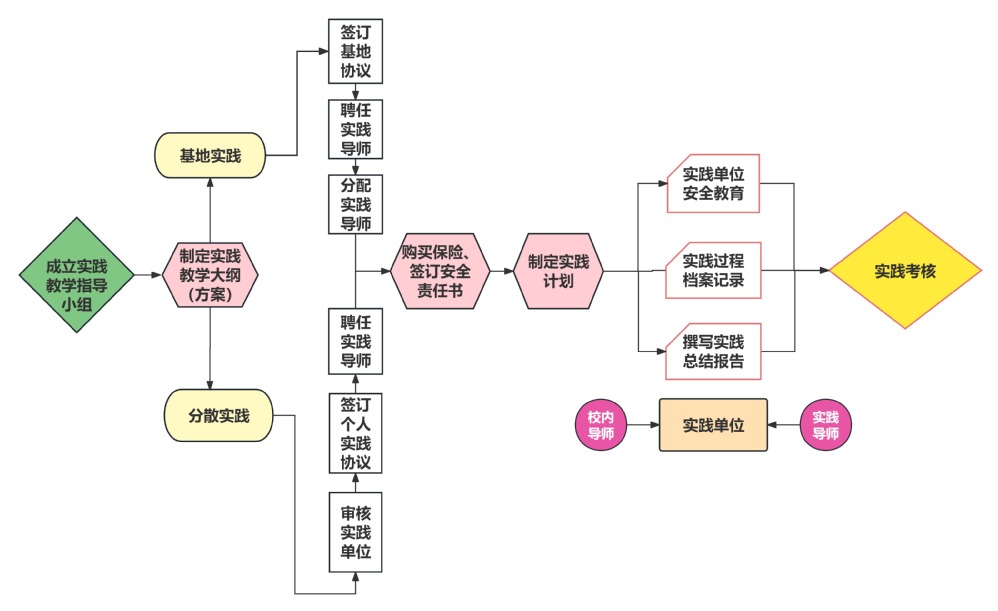 按照“基地实践+分散实践”相结合原则,学院履行专业实践管理的主体责任,成立实践教学工作指导小组并编制实践教学大纲(或工作方案)(见附件1),切实做好专业实践的部署、审核、派出、监管和考核等过程管理工作。