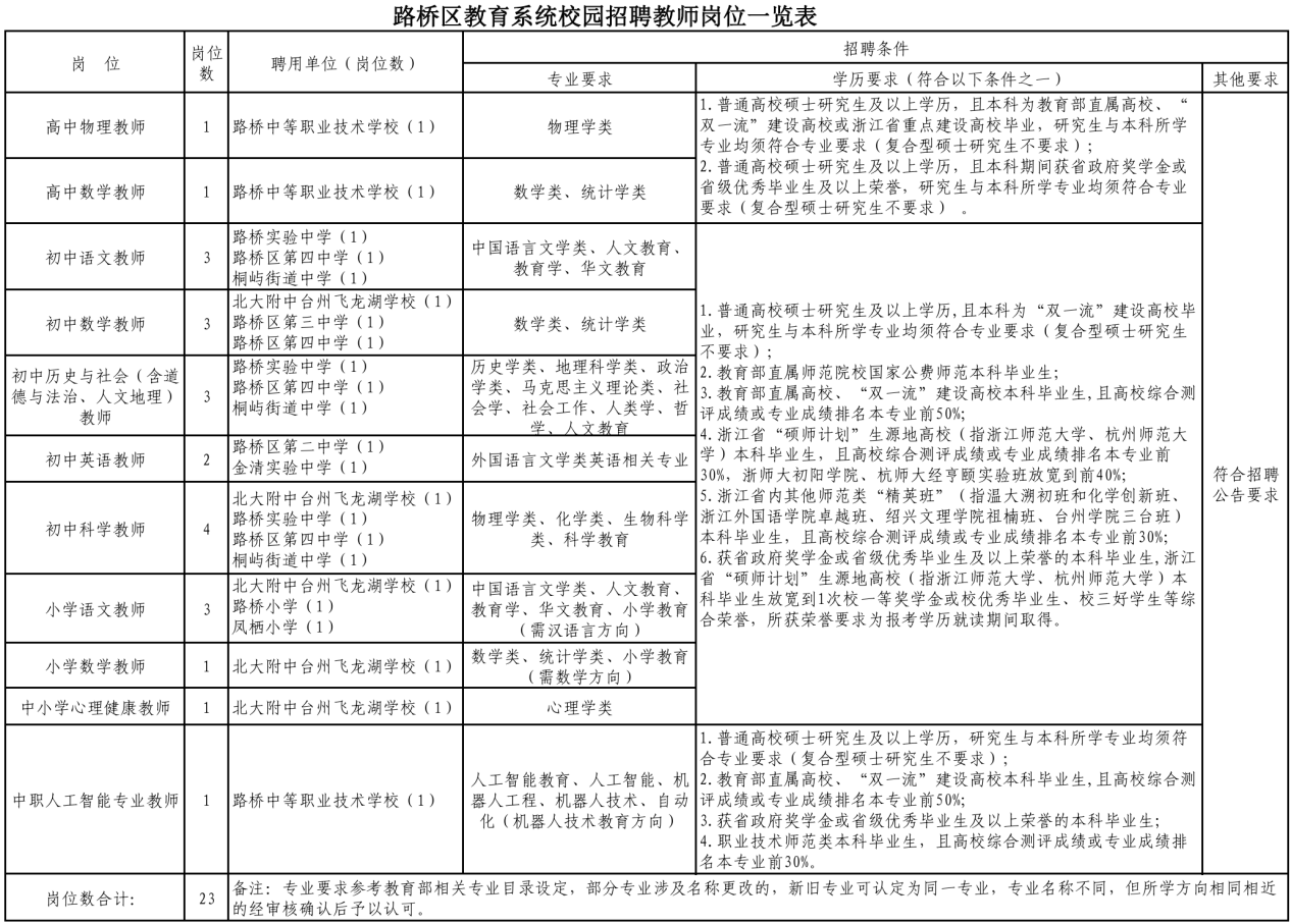 台州市路桥区教育系统校园招聘教师公告