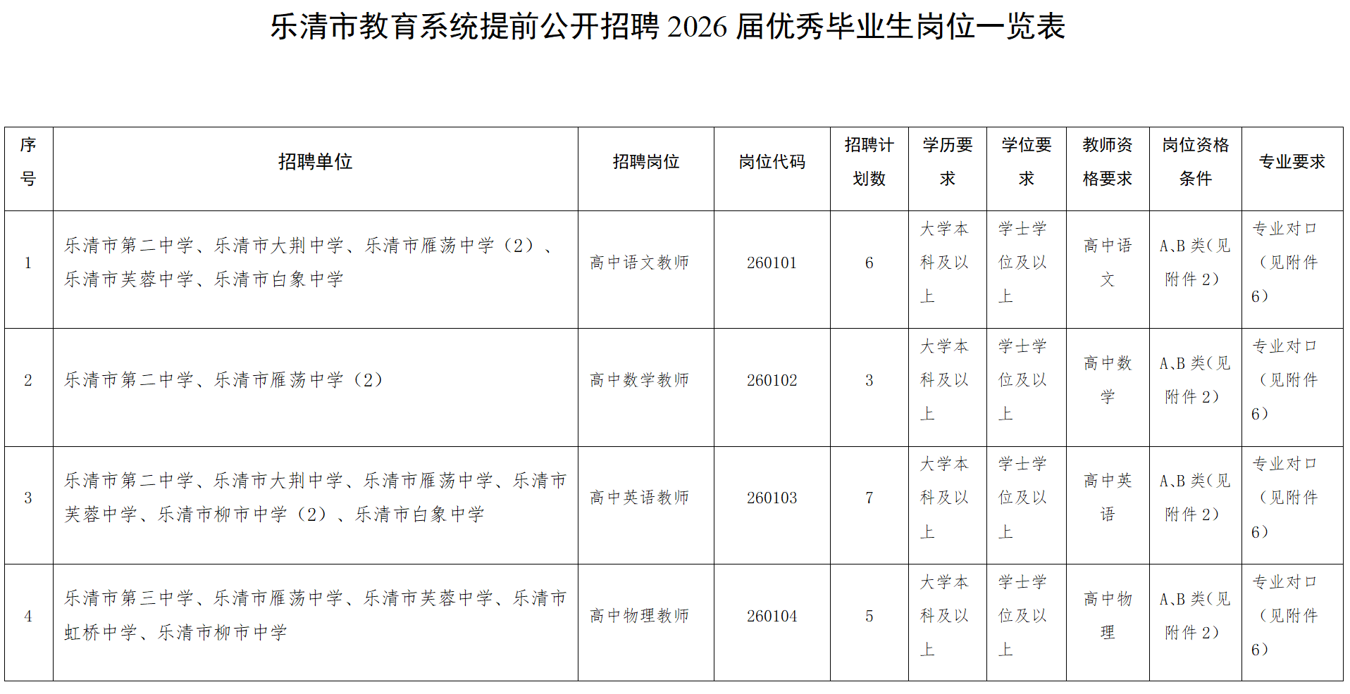 乐清市教育局 乐清市人力资源和社会保障局关于提前公开招聘2026届优秀毕业生的公告
