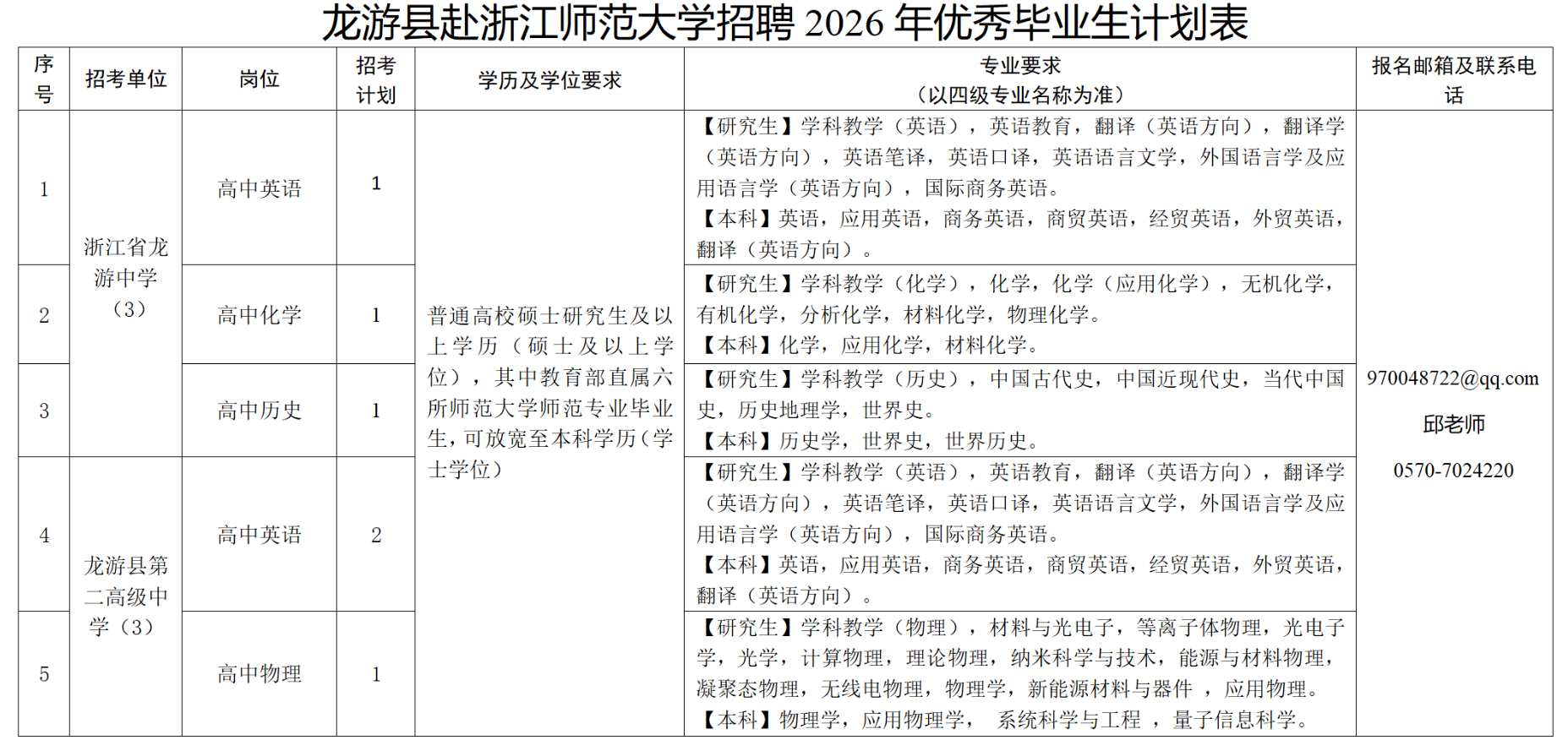 龙游县2026学年新教师提前批招聘公告 (浙江师范大学)