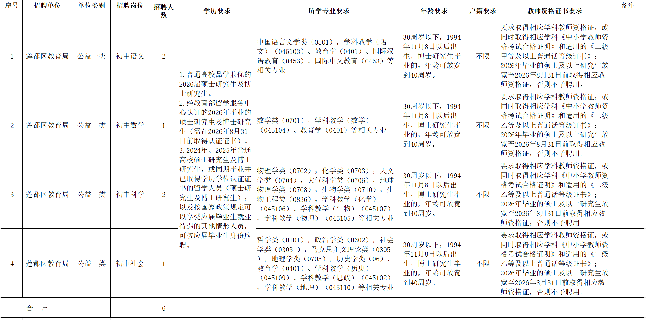 (一)招聘人数:6人