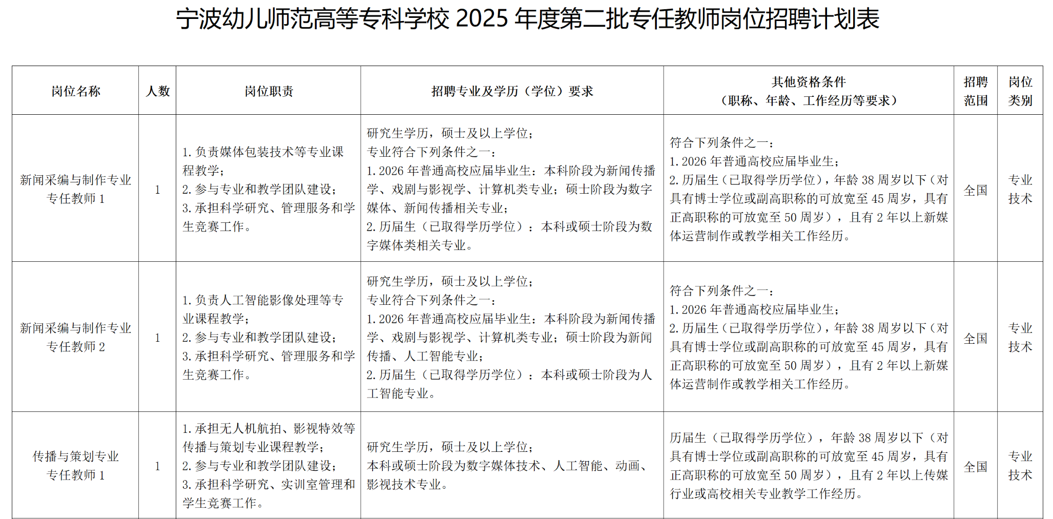 宁波幼儿师范高等专科学校公开招聘专任教师公告