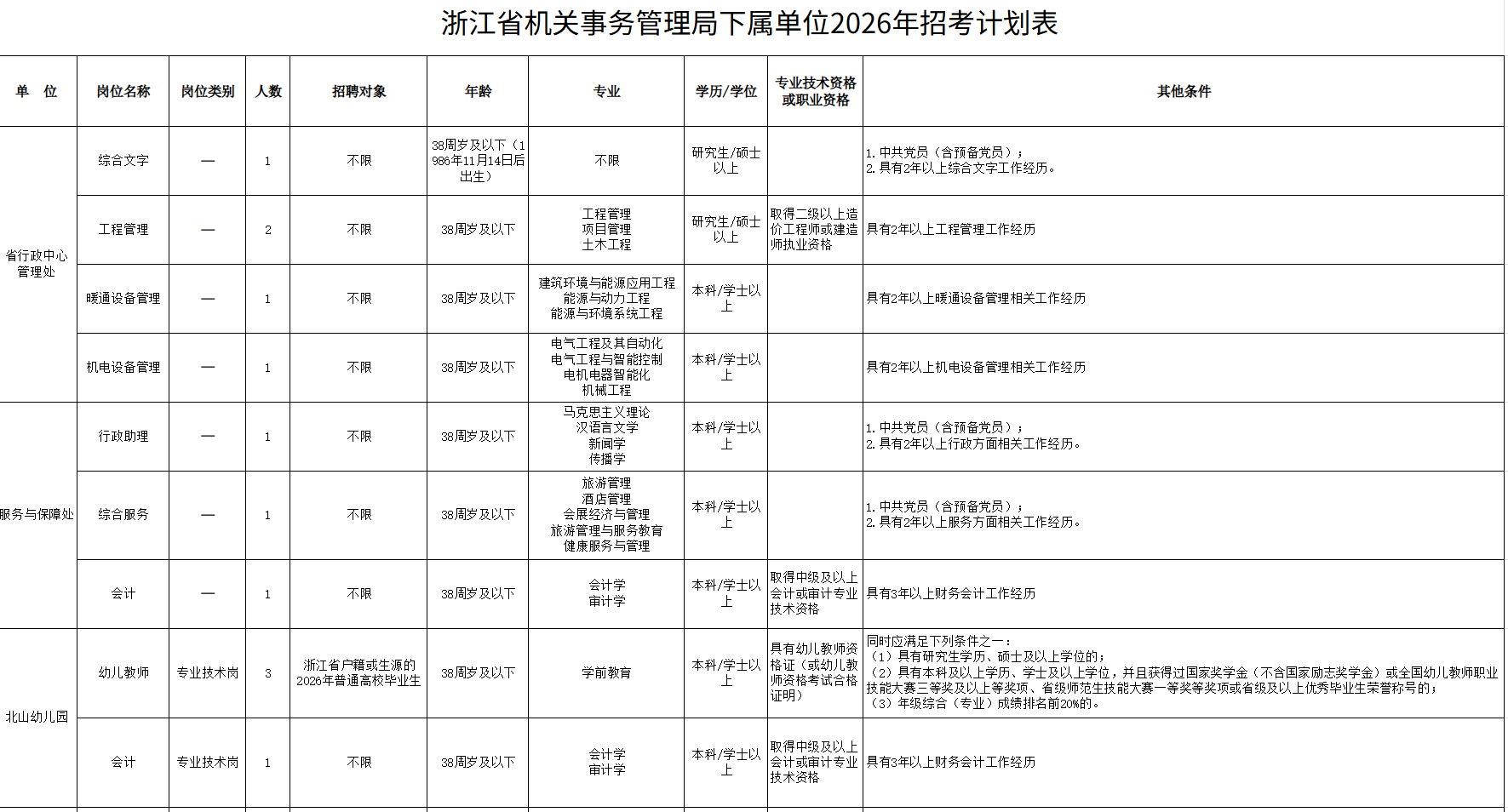 浙江省机关事务管理局关于后勤服务编制单位及直属幼儿园2026年公开招录(聘)人员的公告