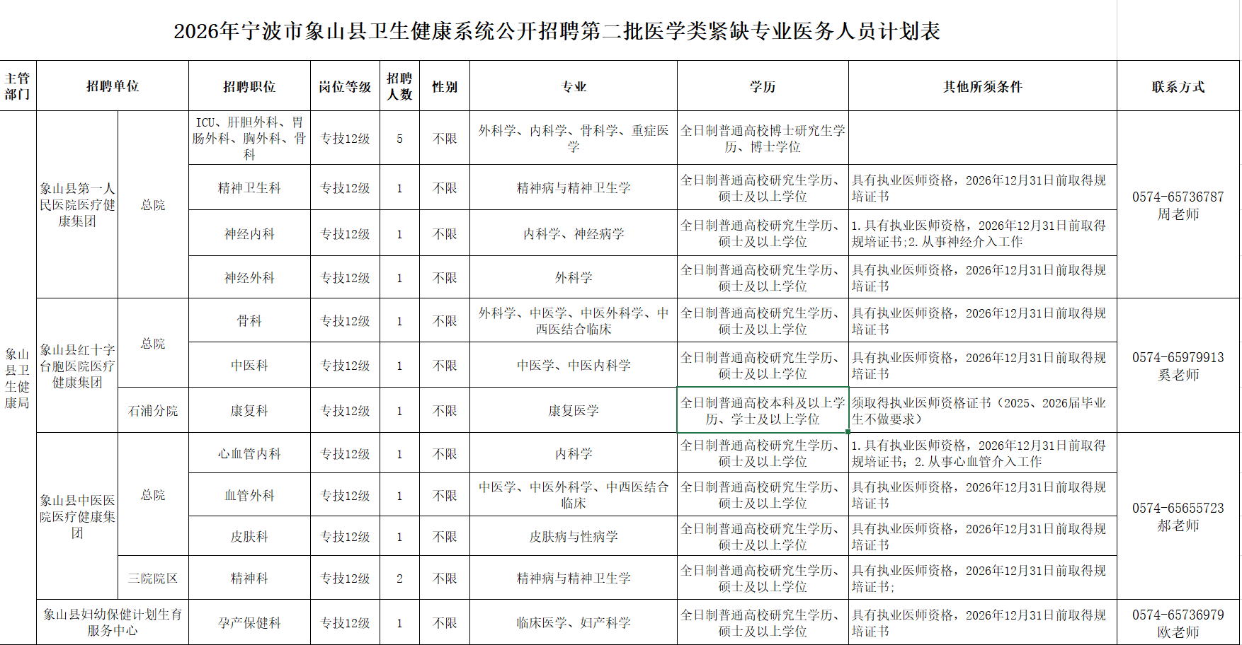 2026年宁波市象山县卫生健康系统公开招聘第二批医学类紧缺专业医务人员公告