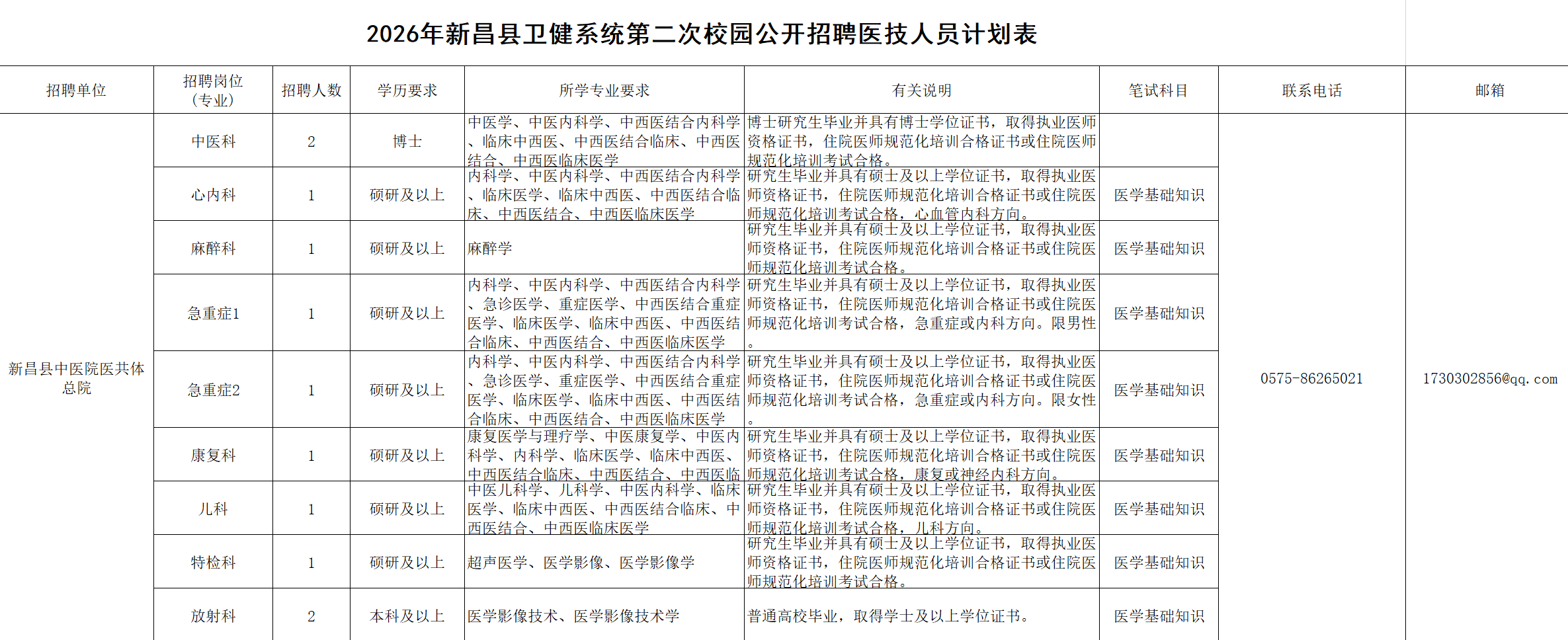 2026年新昌县卫健系统第二次校园公开招聘医技人员公告