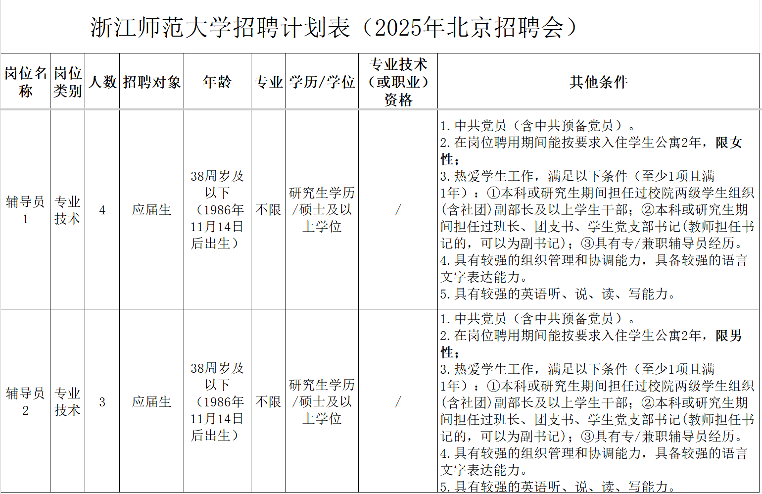 现场报名:11月17日—11月21日,每天上午9:00—11:30,下午14:00—16:30于北京友谊宾馆怡宾楼大厅;11月22日上午8:30-10:30于“才聚浙江—2025北京高层次人才洽谈会”现场