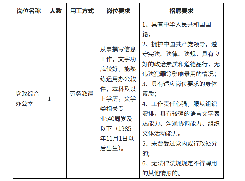 1 | 编外工作人员 | 1 | 不限 | 本科及以上学历 | 年龄40周岁以下 | 能熟练运用计算机办公软件,有综合文字基础,有较强的沟通协调能力,有相关工作经验者优先;中共党员优先;所在户籍为温州市区; |