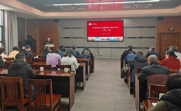 为进一步提升学校学科与人才工作的理论水平与实践能力,推动相关业务条线工作高质量发展,2025年12月31日,我校研工人事业务条线干部履职能力提升培训班系列讲座在明达楼230会议室举行。本次讲座由研究生院院长胡文军主讲,研工人事条线全体干部及骨干员工参加了本次学习。
