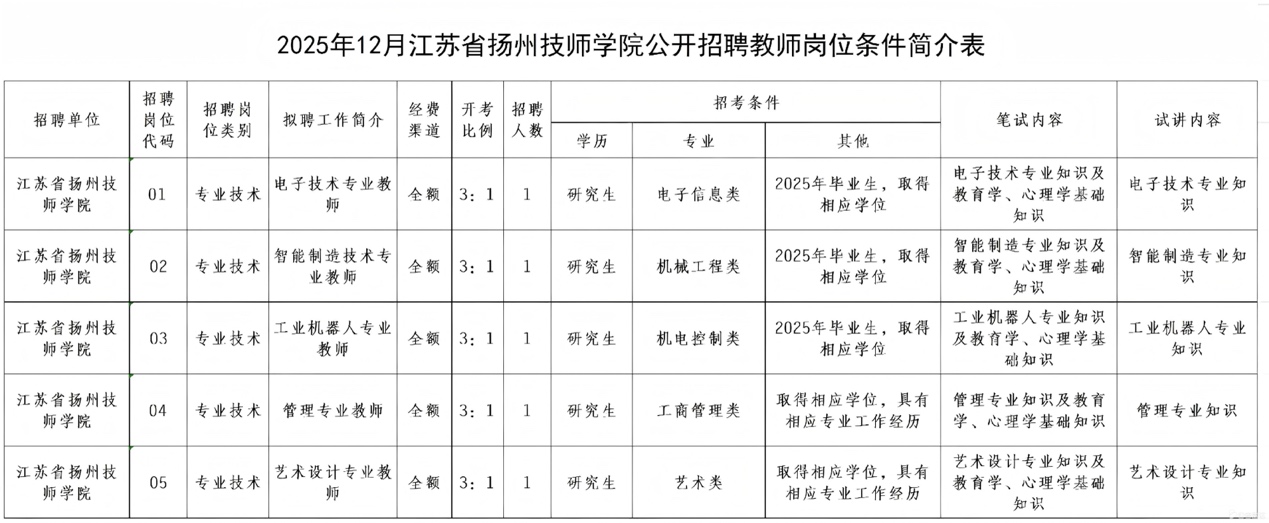 2025年12月江苏省扬州技师学院公开招聘教师公告